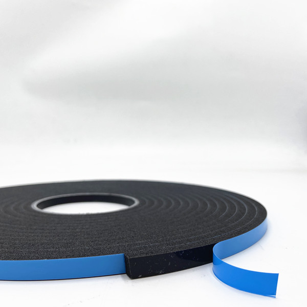 High density double-sided blue film PVC foam tape is made by 300-400kg/m3 density PVC foam. The foam sealant combines a closed-cell polyvinyl chloride foam substrate with a pressure-sensitive adhesive on both sides.